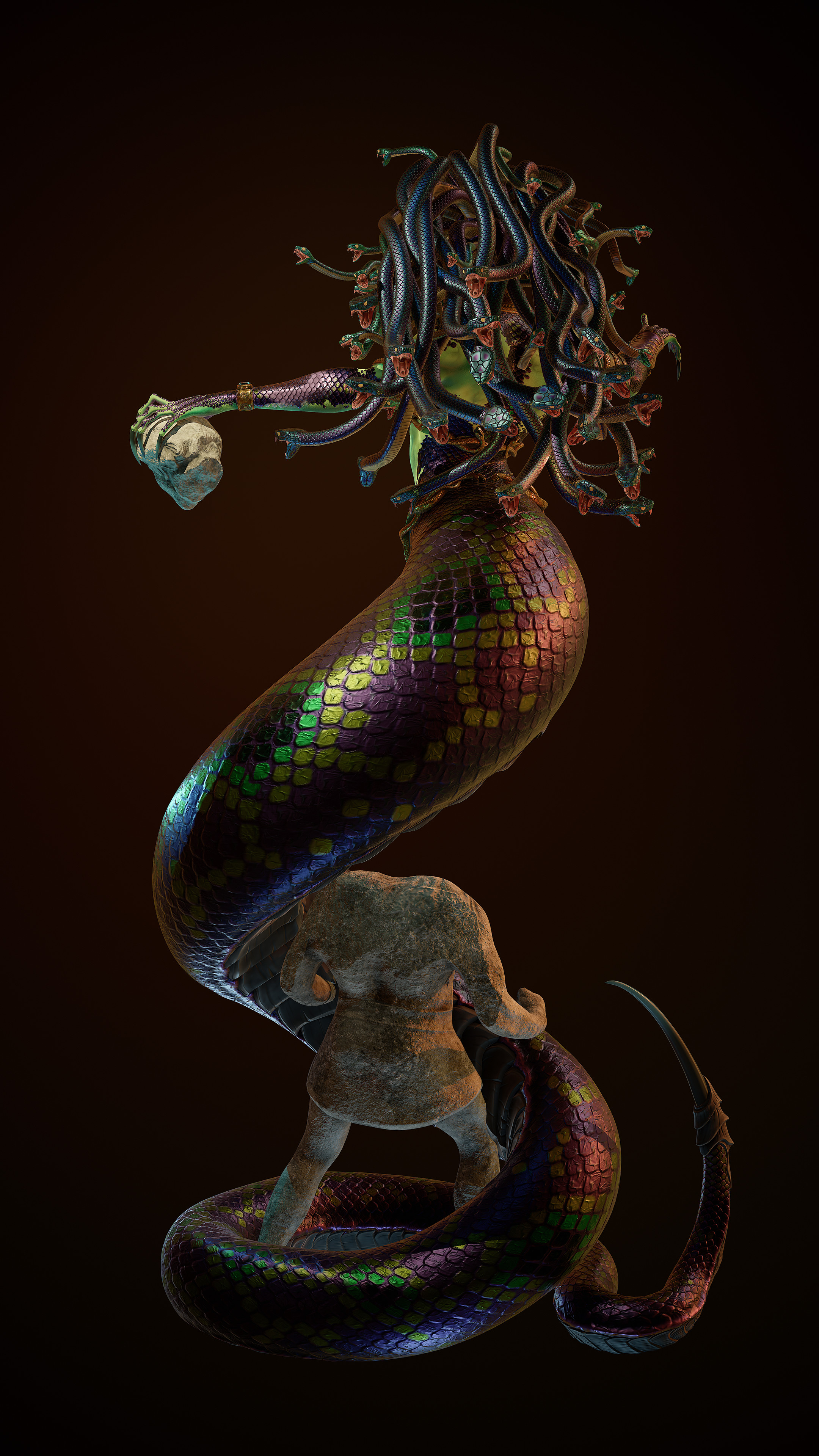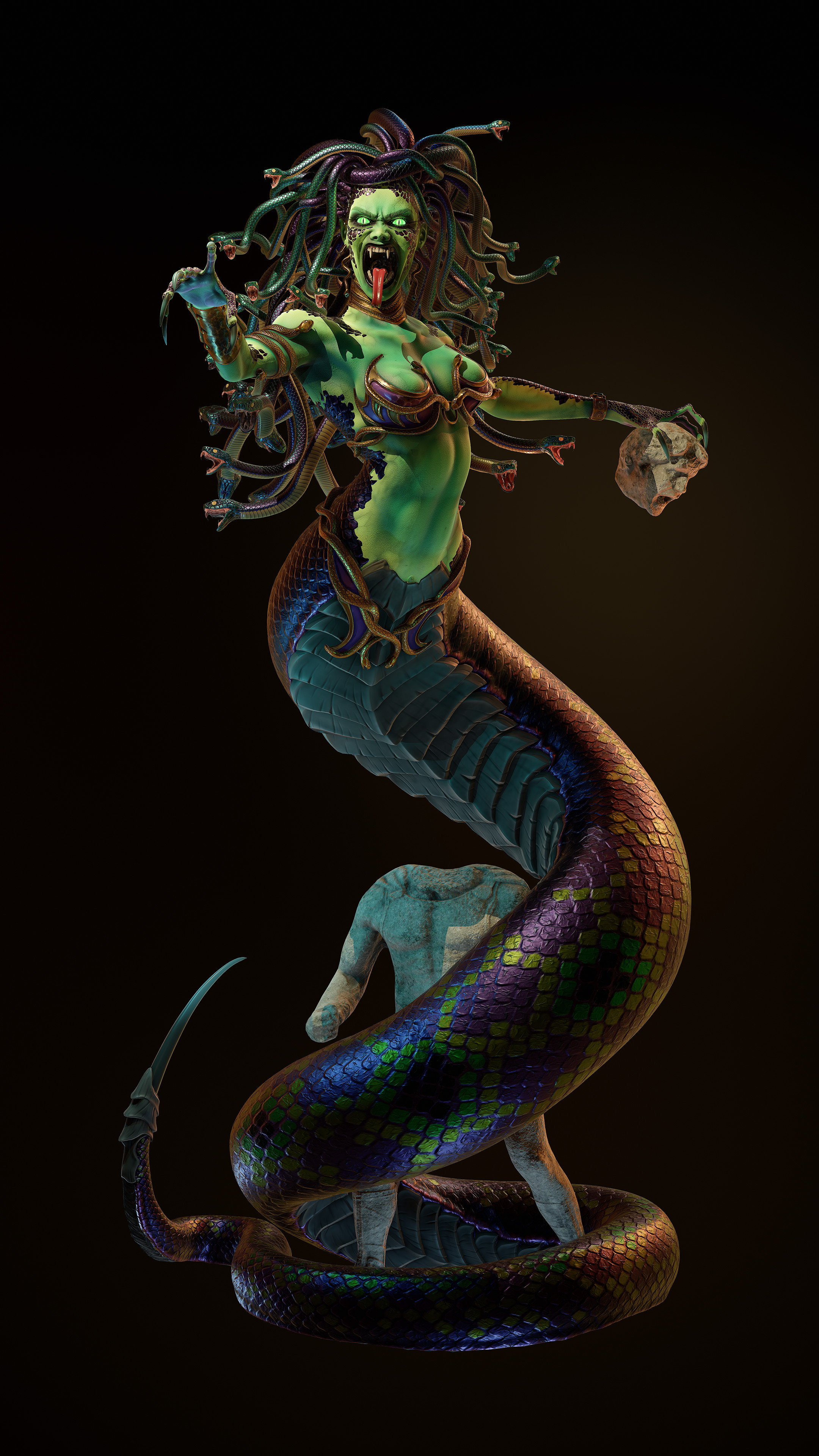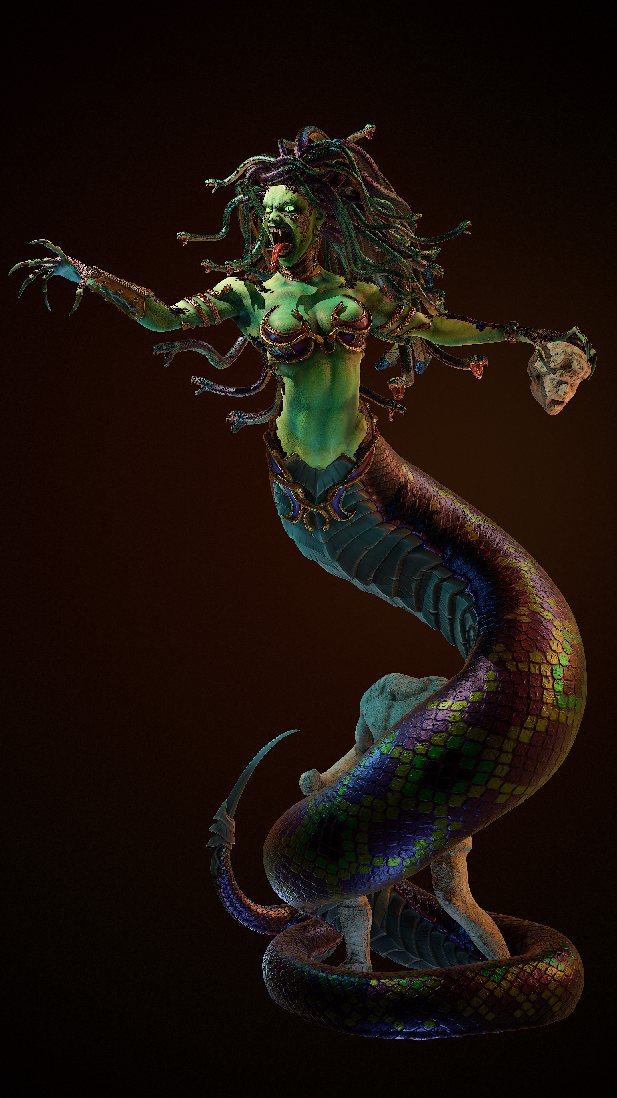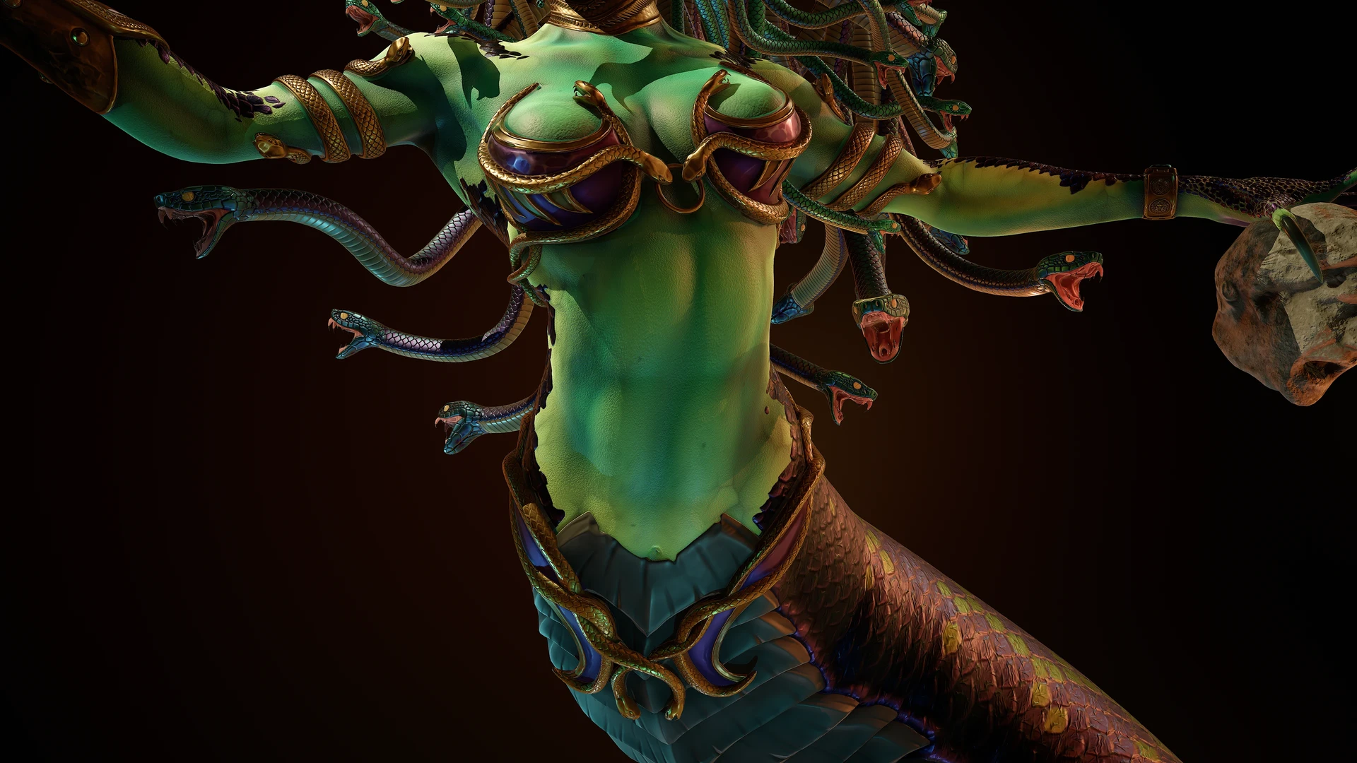 This is my interpretation of Medusa, created as a complete real-time character model with sculpting, texturing, shading, and rendering. My goal was to blend mythology, creature design, and stylised realism to create a Medusa that feels powerful, dangerous, and expressive.
